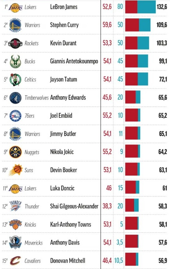 Što se tiče zarada od plaća (crvene brojke u tabeli), čak 11 igrača u TOP 15 zarađuju više od Jamesa.