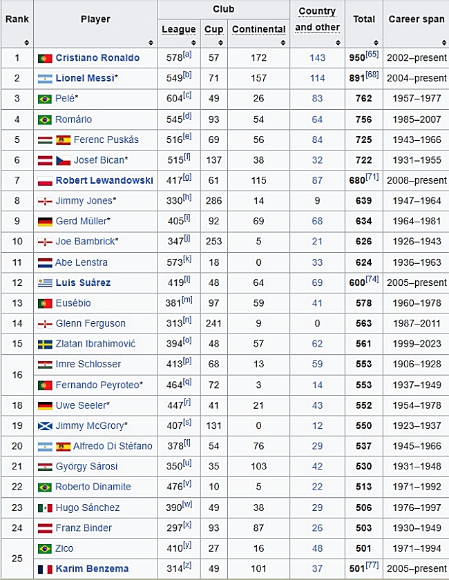 Na listi TOP 25 svih vremena (tablica ispod teksta), samo su petorica igrača još uvijek aktivni (Cristiano Rolando, Leo Messi, Robert Lewandowski, Luis Suarez, Karim Benzema).