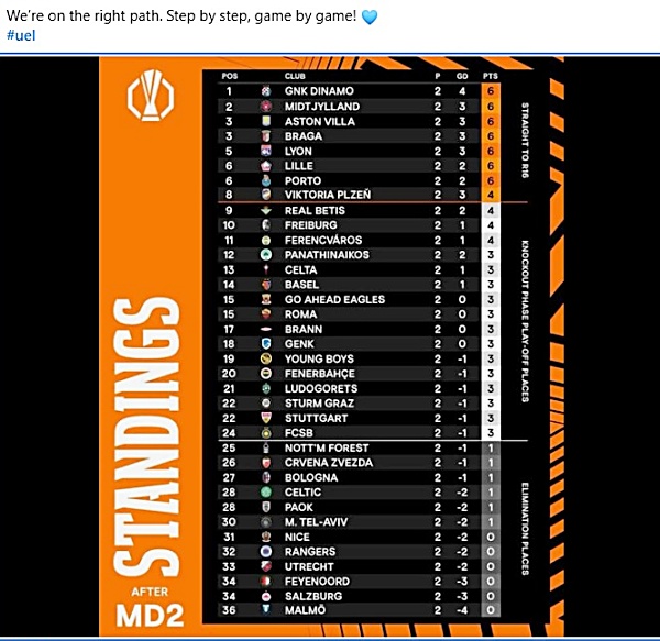 GNK Dinamo na svojoj stranici objavio je ljestvicu Europske lige nakon dva kola uz sljedeću poruku na engleskom jeziku: