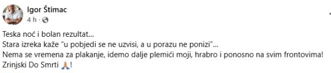 Trener Igor Štimac odmah je preuzeo odgovornost za debakl u poljskom Lublinu, a posebnu pažnju izazvala je njegova objava na društvenim mrežama koju je potpisao sa Zrinjski Do Smrti!